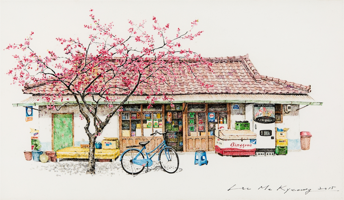 [비건뉴스=최유리 기자] 서울옥션이 온라인 경매를 통해 이미경 작가의 작품 ‘무제’를 출품했다. 해당 작품은 지붕이 낮은 작은 가게와 자전거, 봄꽃이 핀 나무 등을 세밀하게 담아낸 화면으로, 구멍가게 풍경을 떠올리게 하는 구성이 특징이다.