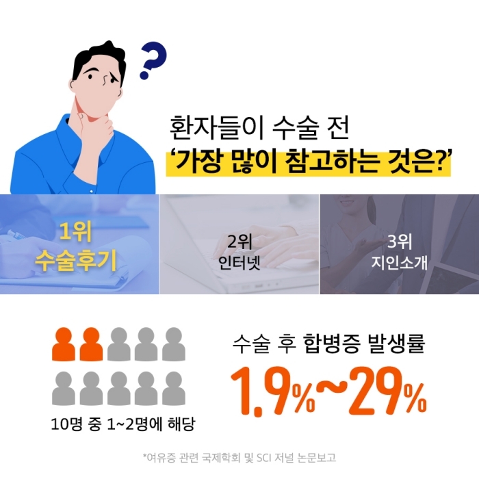 치료를 고민하는 환자들이 가장 먼저 참고하는 정보는 이미 수술을 받은 환자들의 경험담, 이른바 수술 후기다. 수술에 대한 막연한 두려움을 낮추고 치료 결정을 내리는 데 일정 부분 도움을 주는 자료로 활용되지만, 후기만으로 수술 여부를 결정하는 데에는 한계가 있다는 지적도 나온다.