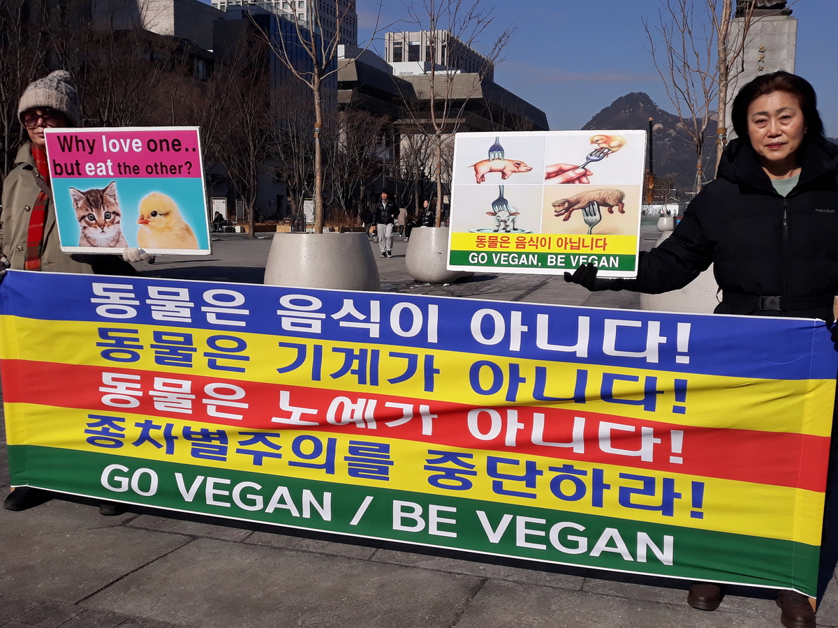 왼쪽에는 고양이와 병아리 이미지가, 오른쪽에는 돼지와 병아리, 소, 양 이미지가 담긴 피켓을 든 참가자들이 비건 채식 실천을 촉구하고 있다. 이 기자회견은 한국동물보호연합, 한국비건채식협회, 기후위기비건행동, 한국비건연대, 한국채식연합이 공동 주최했다.