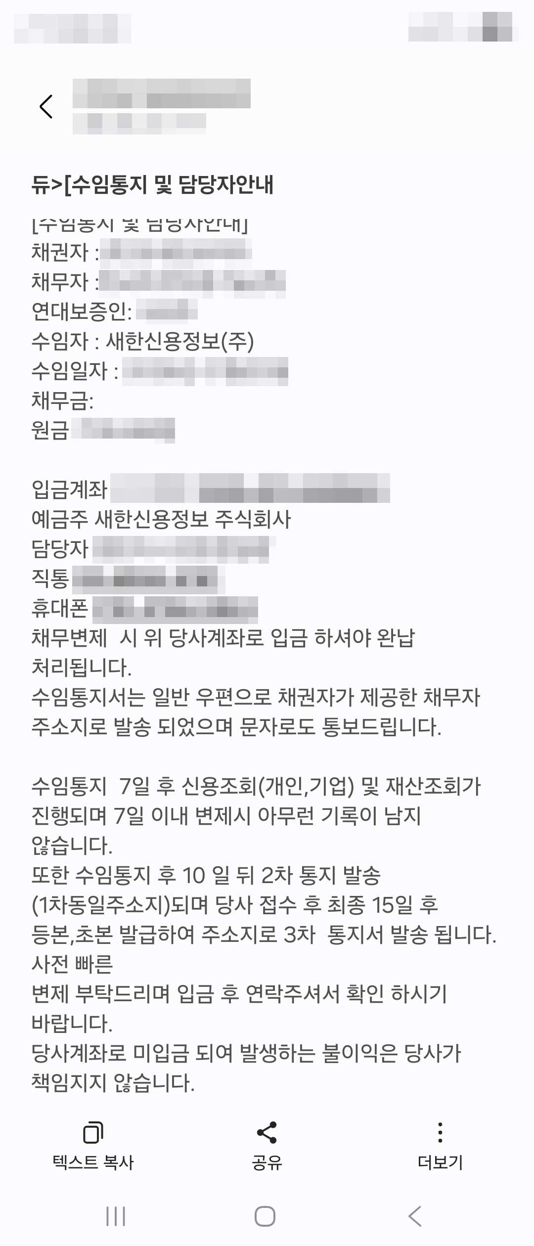 문자 발신 명의는 새한신용정보 주식회사로 확인됐다. 수신자는 해당 표현이 실제 가능한 조치인지, 채권추심 과정에서 허용되는 범위를 벗어난 것은 아닌지 문제를 제기하며 금융감독원에 민원을 접수했다.