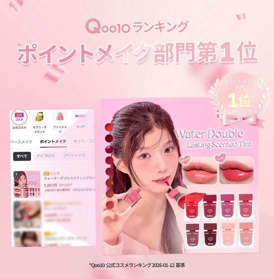 큐텐 재팬 공식 랭킹(1월 12일 기준)에 따르면 ‘워터 더블 래스팅 센티드 틴트’는 포인트 메이크업 부문 전체 1위를 기록했다. 해당 부문은 색조 제품 중심으로 경쟁이 집중되는 영역으로, 일본 시장에서도 경쟁 강도가 높은 카테고리로 꼽힌다.