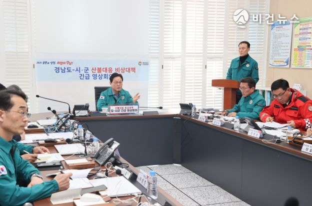 박완수 도지사 주재로 이날 오전 산청군청에서 열린 ‘산불대응 비상대책 도-시·군 긴급 영상회의’에서는 도내 산불 상황과 시군별 대응 계획을 공유하고, 대응체계를 점검했다.