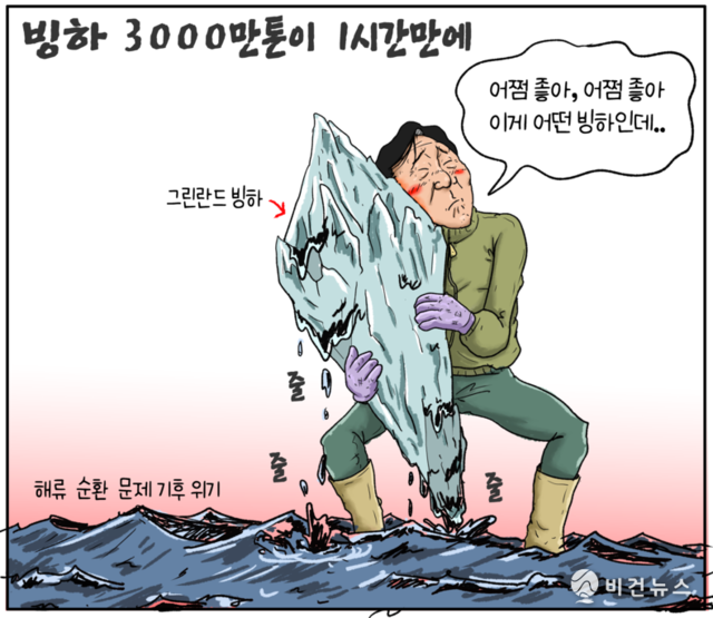 [비건만평] "해수면 상승 재앙 눈앞에"…그린란드 빙하, 1시간 만에 3000만 톤 녹았다