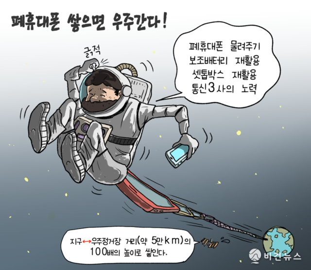 [비건만평] 버려진 휴대폰 쌓으면 우주까지?…통신3사, 폐휴대폰 재활용 프로그램 마련