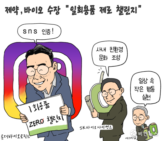 [비건만평] 제약·바이오 수장 '일회용품 제로 챌린지' 동참…"작은 실천으로 탄소중립 시작"
