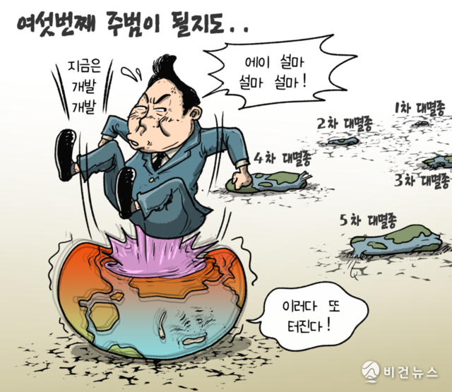 [비건만평] "개발만 하다 기후변화로 6차 대멸종 올지도"…마지막 경고
