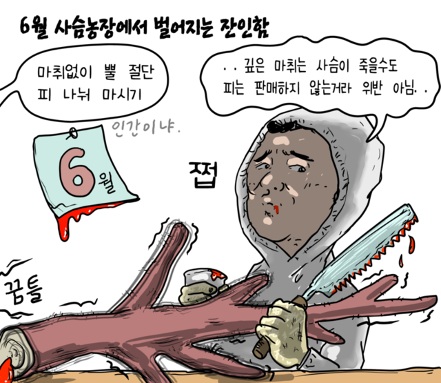 [비건만평] '피의 6월' 사슴 농장서 마취없이 뿔 잘라…생피 나눠 마시기도