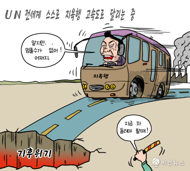 [비건만평] 유엔 총장 “기후위기, 지옥行 고속도로 타고 가속페달”