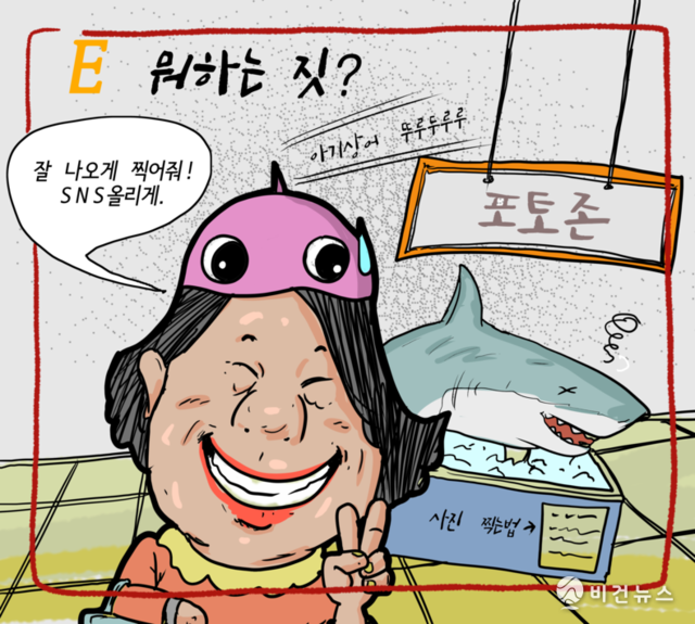 [비건만평] "이게 무슨 짓?" 아기상어 캐릭터 옆 상어 사체와 셀카