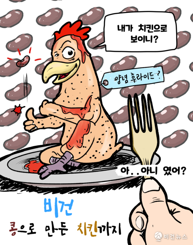 [비건만평] "내가 치킨으로 보이니?"…콩으로 만든 '치킨'이 뜬다