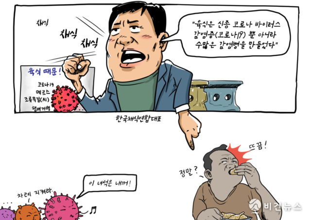 [비건만평] 이원복 한국채식연합 대표, 1인 기자회견…"코로나19는 육식 때문"
