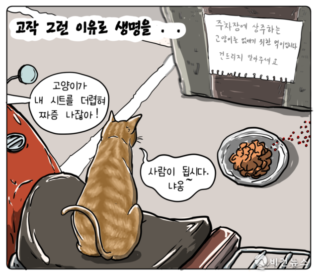 [비건만평] "고양이가 오토바이 시트 더렵혀" 살생용 먹이 만든 40대