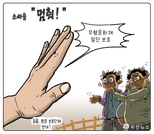 [비건만평] "소싸움 멈춰" 무형문화재 보류…동물학대 논란