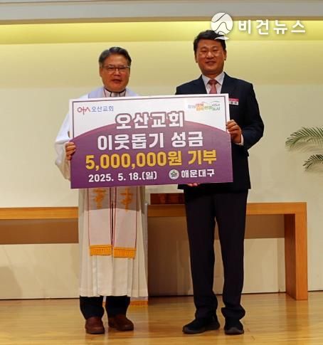 [비건뉴스=최지영 수습기자] 오산교회는 지난 18일, 해운대구 저소득 아동을 돕기 위해 지난해 이어 50일 특별기도회 기간동안 모금한 성금 5백만 원을 해운대구에 기탁했다.
