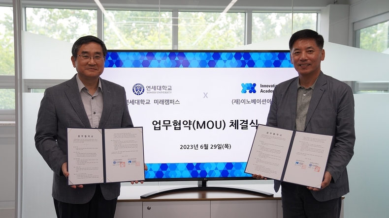 [비건뉴스 이용학 기자] (재)이노베이션 아카데미(학장 전영표)가 연세대학교 미래캠퍼스(부총장 권명중)와 업무협약을 체결했다고 5일 밝혔다.
