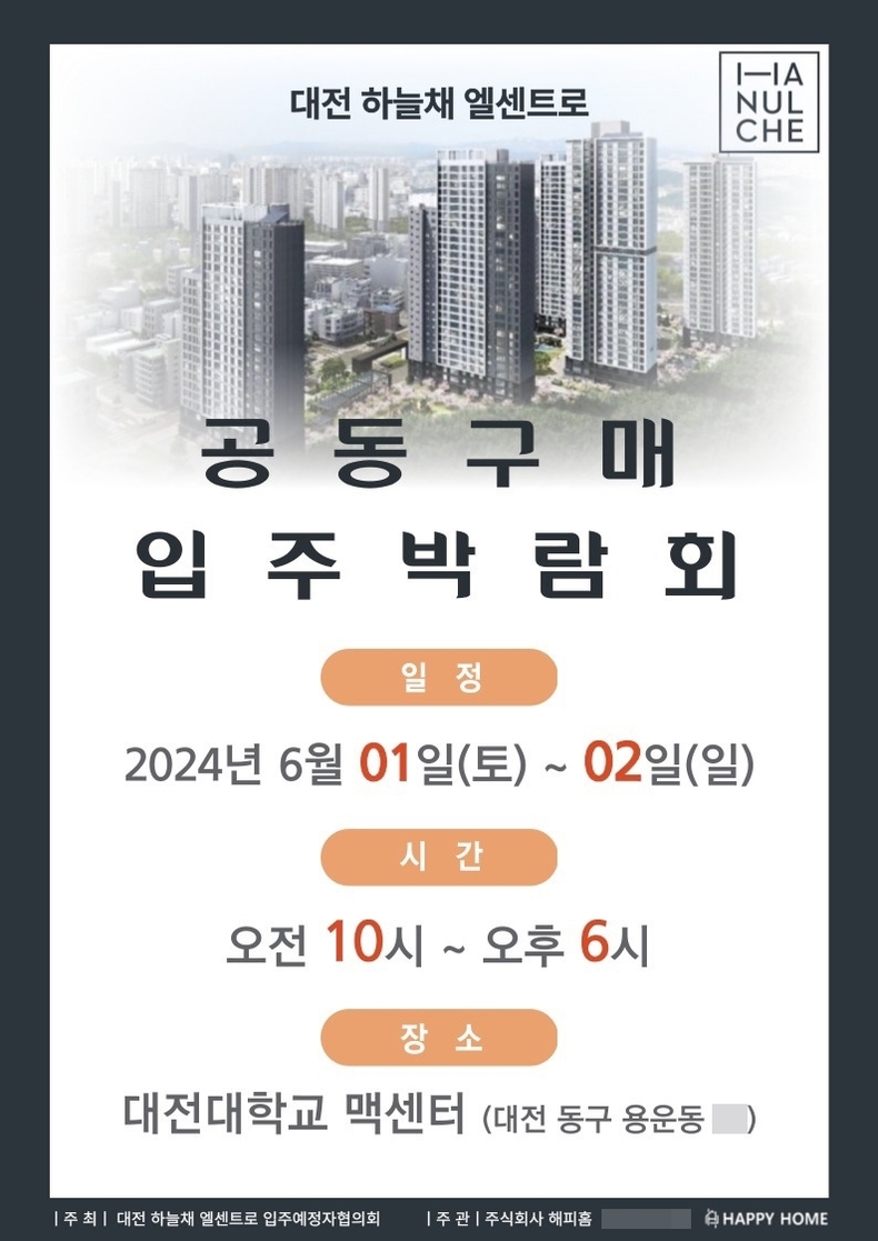 이번 입주박람회는 (주)해피홈이 주관을 하며 '대전 하늘채 엘센트로 입주예정자협의회'가 주최한다.