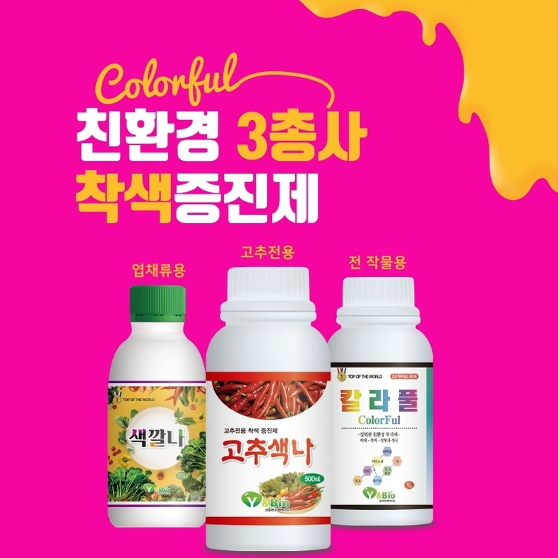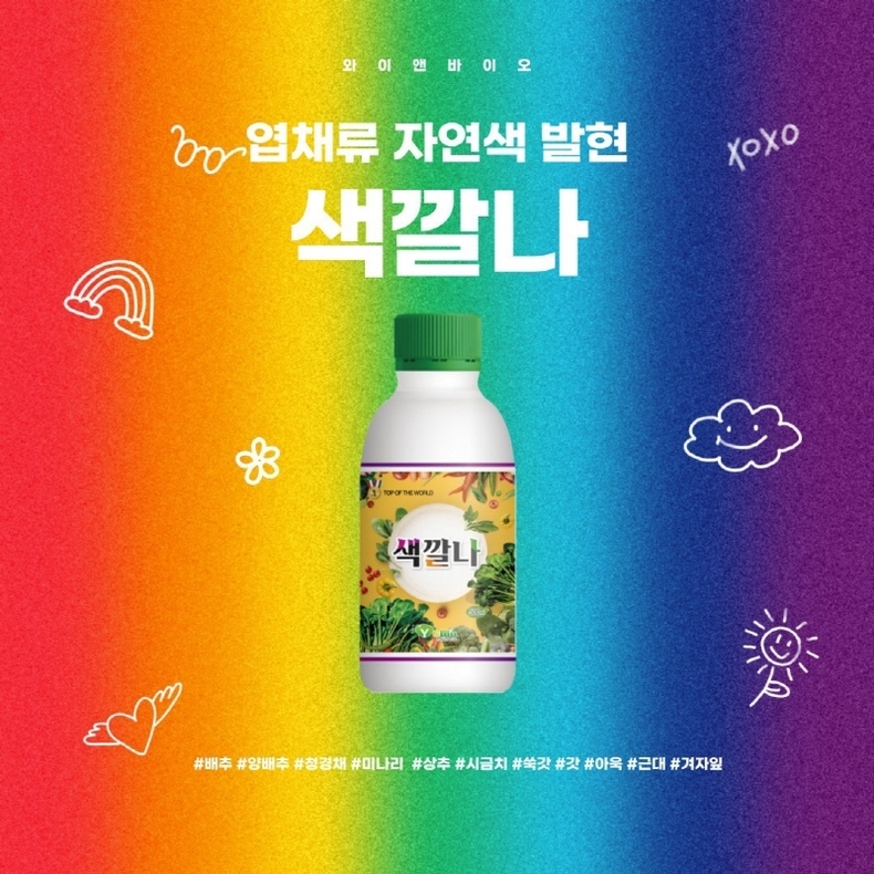 배추, 상추, 쌈채소 등의 광합성 향상 자연색 착색증진제 ‘색깔나’는 엽채류 전용제로 24종의 아미노산 중 글루타민산, 글리신, 시스틴, 메니초닌, 프롤린 등과 순수 광물질 미네랄을 결합한 친환경 기능성 제제로 광합성을 촉진해 잎의 색과 광택에 도움을 주며, 뿌리 활착과 뿌리 생육에도 도움을 준다.