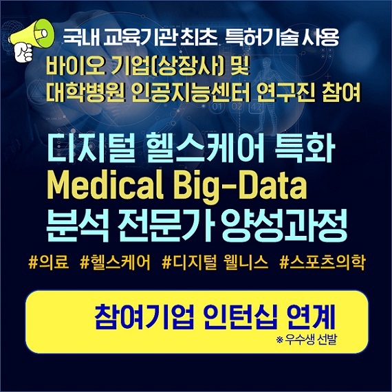 [비건뉴스=김민정 기자] 아시아경제 교육센터가 ‘디지털 헬스케어 특화 메디컬 빅데이터 분석 전문가 양성과정’에 참여할 교육생을 모집한다.