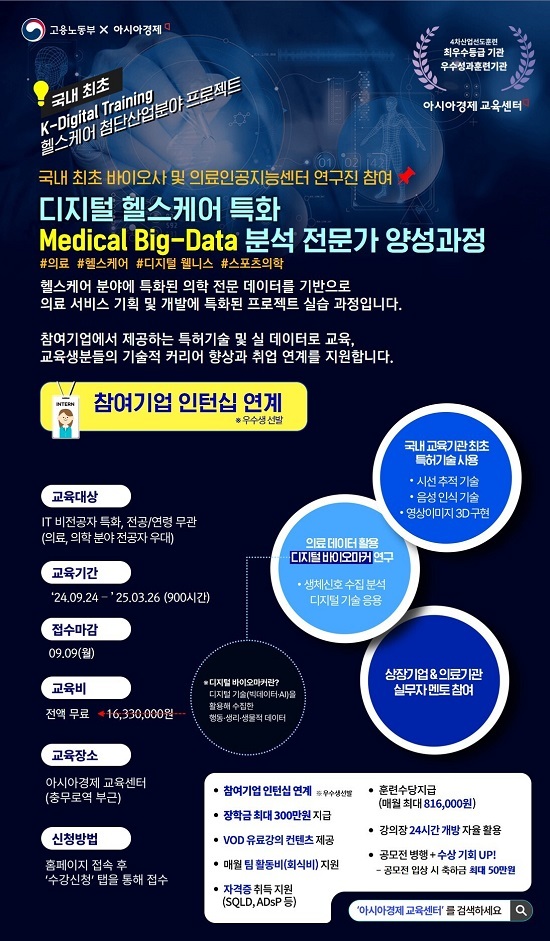 [비건뉴스=김민정 기자] 아시아경제 교육센터가 ‘디지털 헬스케어 특화 메디컬 빅데이터 분석 전문가 양성과정’에 참여할 교육생을 모집한다.