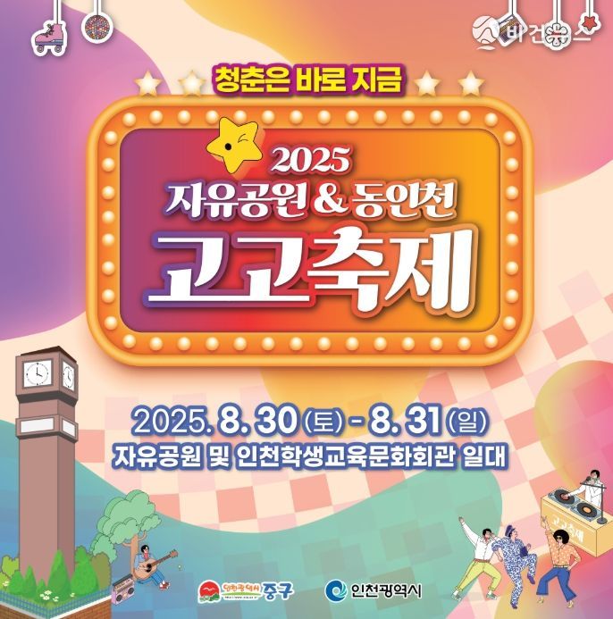 [비건뉴스=최지영 수습기자] 인천시 중구는 8월 30일 ~ 31일 열정과 낭만의 계절 여름을 맞이해 ‘청춘’을 만끽할 수 있는 2025 자유공원·동인천 고고축제 인천 중구 자유공원과 동인천 학생교육문화회관 일원에서 열린다고 밝혔다.