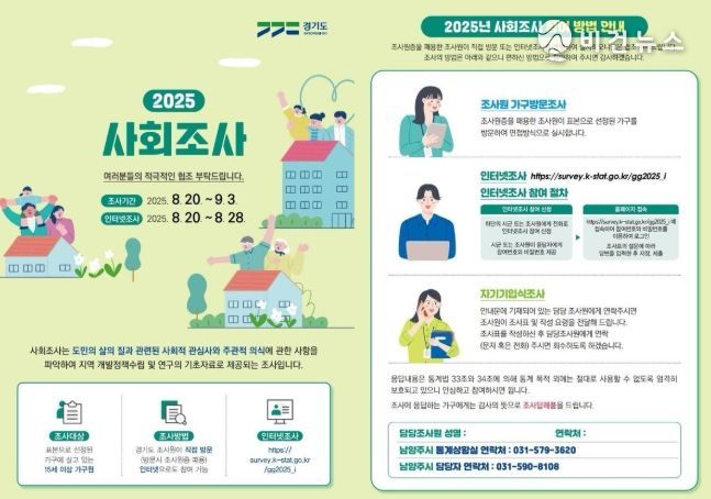 [비건뉴스=최지영 수습기자] 남양주시는 이달 20일부터 9월 3일까지 ‘2025년도 남양주시 사회조사’를 실시한다고 27일 밝혔다.