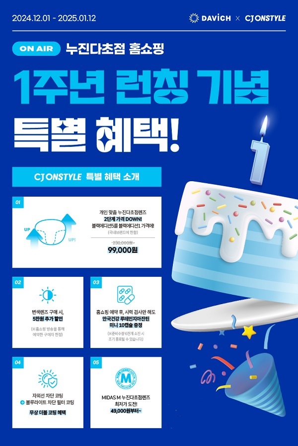 [비건뉴스=김민정 기자] 다비치안경이 누진다초점렌즈 홈쇼핑 론칭 1주년을 맞아 특별 방송을 준비했다고 1일 밝혔다.