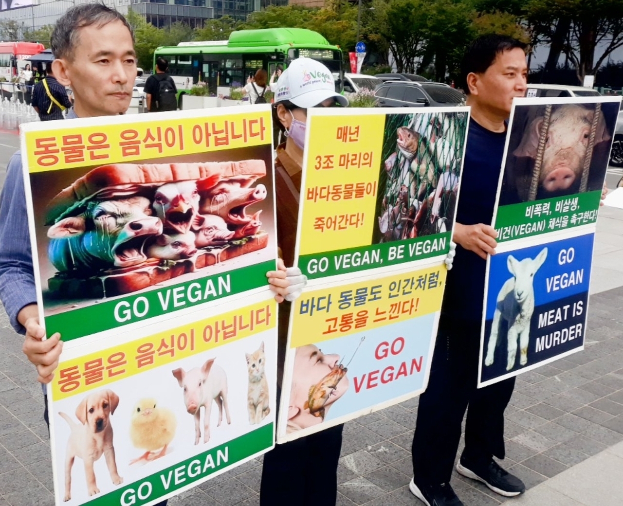 [비건뉴스=최유리 기자] 세계 채식인의 날을 맞아 한국비건채식협회, 기후위기비건행동, 한국비건연대, 비건세상을위한시민모임, 한국채식연합 등 비건 시민단체들이 1일 서울 광화문 이순신 동상 앞에서 기자회견을 열고 채식 실천을 촉구했다. 참가자들은 피켓과 퍼포먼스를 통해 건강, 동물, 환경, 지구를 살리는 비건 채식의 필요성을 강조했다.