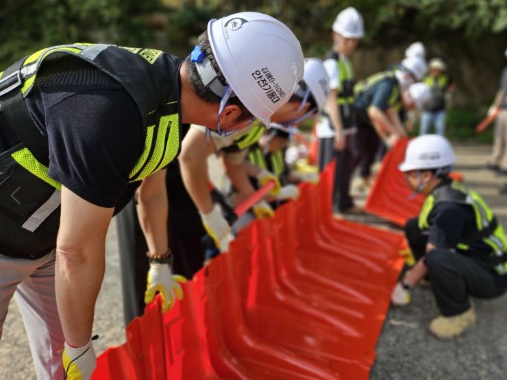 또 침수 피해를 예방하기 위한 모래주머니를 쌓는 제방 구축 훈련이 이뤄졌고 재난 현장 교통통제와 우회로 안내 요령도 함께 숙달했다.