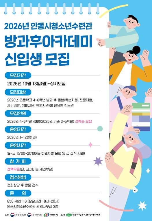 [비건뉴스=최지영 수습기자] 안동시시설관리공단이 운영하는 청소년수련관 방과후아카데미가 오는 10월 13일부터 2026년도 신입생 모집을 시작한다.