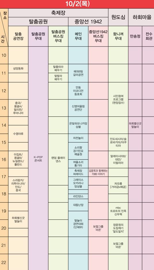 안동시는 “일곱째 날은 전통 탈춤, 해외공연, 그리고 K-POP 무대가 함께 어우러져 남녀노소 누구나 즐길 수 있는 다채로운 날”이라며, “특히 한류관광페스타는 국내외 관광객을 아우르는 대표 프로그램이 될 것”이라고 밝혔다.