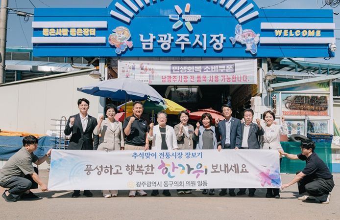 [비건뉴스=최지영 수습기자] 광주광역시 동구의회는 10월 1일 추석을 앞두고 지역 경제 활성화를 위해 대인시장, 남광주시장, 산수시장에서 동구랑페이를 활용해 ‘전통시장 장보기 행사’를 진행했다. 이번 행사는 고물가와 소비 위축으로 어려움을 겪는 전통시장의 활력 회복을 돕고, 현장 중심의 소통을 강화하기 위해 마련됐다.