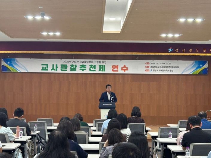 [비건뉴스=최지영 수습기자] 포항교육지원청은 10월 1일 포항교육지원청 대회의실에서 초ㆍ중등 영재교육업무 담당 교사 100여명을 대상으로 '2026학년도 영재교육대상자 선발을 위한 교사관찰추천제 연수'를 실시했다.