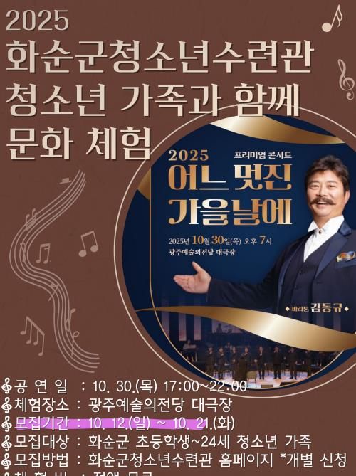 [비건뉴스=최지영 수습기자] 화순군은 2일 청소년수련관에서 짙어가는 가을의 정취 속에 청소년과 가족이 함께하는 특별한 문화체험, 바리톤 김동규의 프리미엄 콘서트'어느 멋진 가을날'을 관람할 청소년 가족 60명을 선착순 모집한다고 밝혔다.