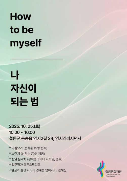 [비건뉴스=최지영 수습기자] 철원문화재단은 2025년 10월 25일 오전 10시부터 16시까지 양지리 레지던시를 개방해 웰니스 문화행사를 진행한다.