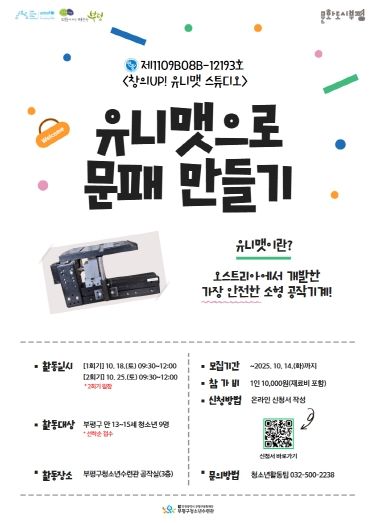[비건뉴스=최지영 수습기자] 부평구 청소년수련관은 오는 14일까지 부평 내 14~16세 청소년을 대상으로 ‘창의 UP! 유니맷 스튜디오!’ 참가자를 모집한다.