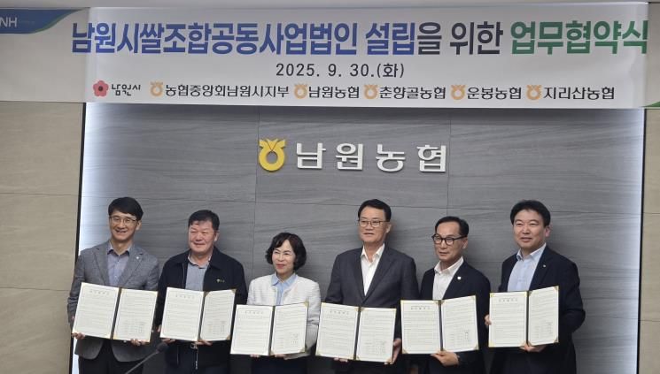 [비건뉴스=최지영 수습기자] 남원시는 이번 9월 30일 남원농협에서 농협쌀조합공동사업법인 설립을 위해 남원시(남원시농업기술센터소장), 농협중앙회남원시지부, 남원농협, 춘향골농협, 운봉농협, 지리산농협과 업무협약식을 개최했다.
