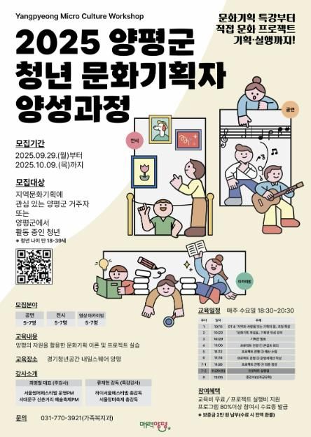 이번 교육은 문화기획에 관심 있는 청년들이 지역 자원과 문화 공동체를 연결해 창의적인 문화 콘텐츠를 기획 및 운영할 수 있도록 실무 중심의 교육과 프로젝트로 구성되며, 경기청년공간 내일스퀘어 양평(양평읍 양근로 196)에서 진행된다.
