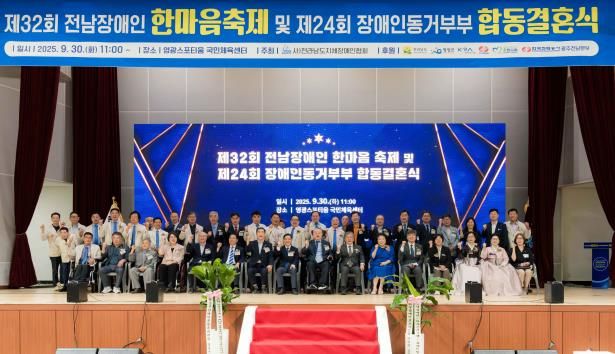 [비건뉴스=최지영 수습기자] 영광군은 지난 30일 영광스포티움 국민체육센터에서 22개 시·군 장애인단체 등 1,500여 명이 참석한 가운데‘제32회 전남장애인한마음대축제 및 제24회 장애인동거부부 합동결혼식’을 성황리에 개최했다고 밝혔다.