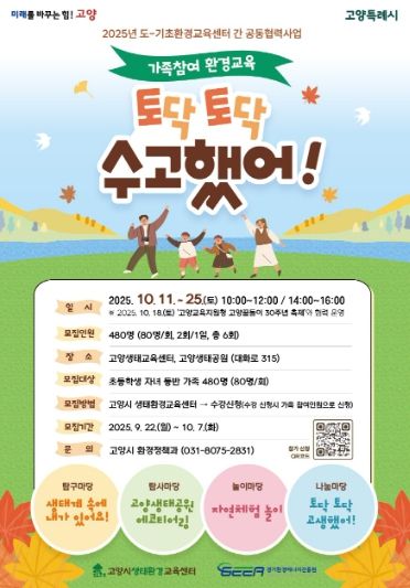 [비건뉴스=최지영 수습기자] 고양특례시는 가족과 함께 참여하는 환경교육 프로그램‘토닥 토닥 수고했어!’를 오는 11일부터 25일까지 매주 토요일 고양생태교육센터와 고양생태공원에서 운영한다고 밝혔다.