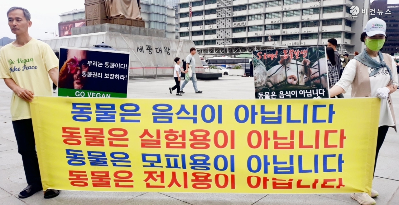 [비건뉴스=서인홍 기자] 3일 서울 광화문 세종대왕상 앞에서 한국동물보호연합 회원들이 세계 동물의 날 기자회견을 열고 현수막과 피켓을 들고 있다. (사진=한국동물보호연합 제공)