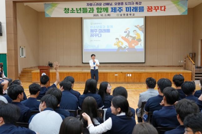 [비건뉴스=최지영 수습기자] 오영훈 제주특별자치도지사는 2일 남원중학교(교장 오경석)를 찾아 전교생을 대상으로 특별강연을 열고, “남원과 제주를 넘어 아시아, 나아가 우주까지 여러분의 무대가 돼야 한다”며 청소년들의 꿈과 도전을 격려했다.