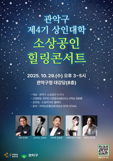 [비건뉴스=최지영 수습기자] 관악구는 오는 10월 29일 오후 3시, 구청 8층 대강당에서 관내 소상공인을 위한 힐링콘서트를 개최한다.