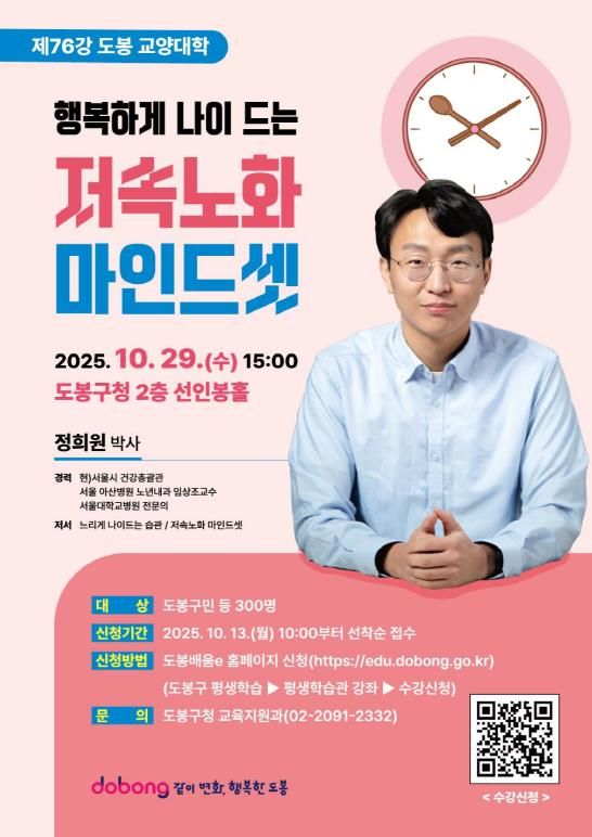 오언석 도봉구청장은 “‘저속노화’를 올바르게 이해하고, 일상에서 실천할 수 있는 건강한 생활습관을 배워볼 수 있는 시간이 되길 바란다.”라고 말했다.