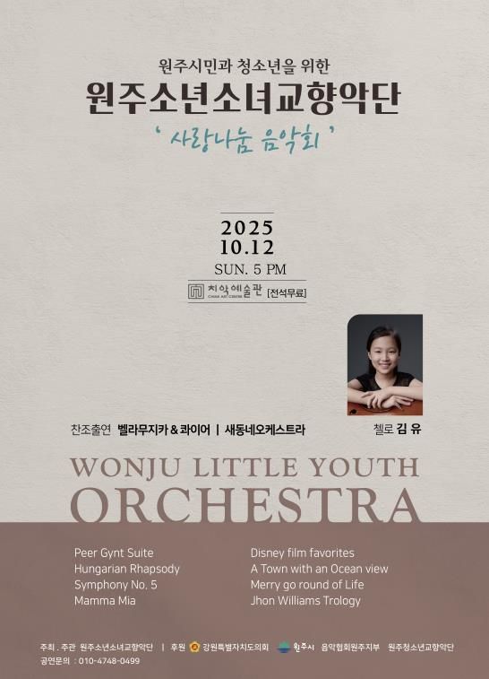 이번 음악회는 원주소년소녀교향악단이 주최하고, 벨라무지카·콰이어 합창단과 새동네오케스트라가 함께 협연해 더욱 풍성한 무대를 선보인다. 특히 벨라무지카·콰이어 합창단이 따뜻하고 웅장한 합창 무대를, 새동네오케스트라가 한층 깊이 있는 하모니를 선사할 예정이다.