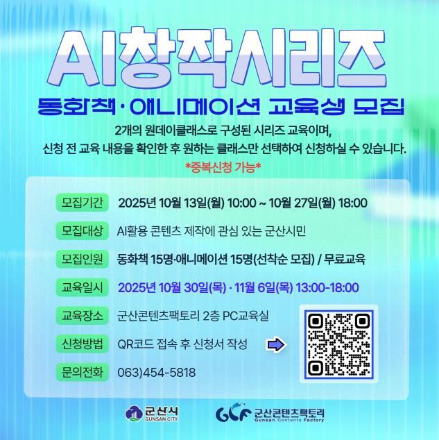 참여 신청은 10월 13일에서 27일까지 군산시청 또는 군산콘텐츠팩토리 누리집을 통해 QR 부호(코드)로 접수 가능하며, 교육 참가 인원은 동화책 15명, 애니메이션 15명으로 선착순 모집 예정이다.