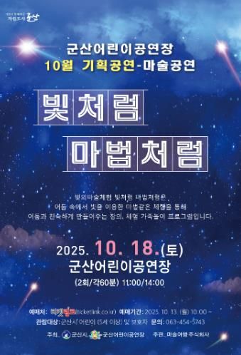 또한 어린이 눈높이에 맞춘 체험형 공연으로 기획되어, 아이들이 평소 쉽게 접하기 어려운 빛과 마술의 세계를 친근하게 경험하며 색다른 매력으로 온 세대가 함께 즐길 수 있는 특별한 시간이 될 것으로 기대된다.