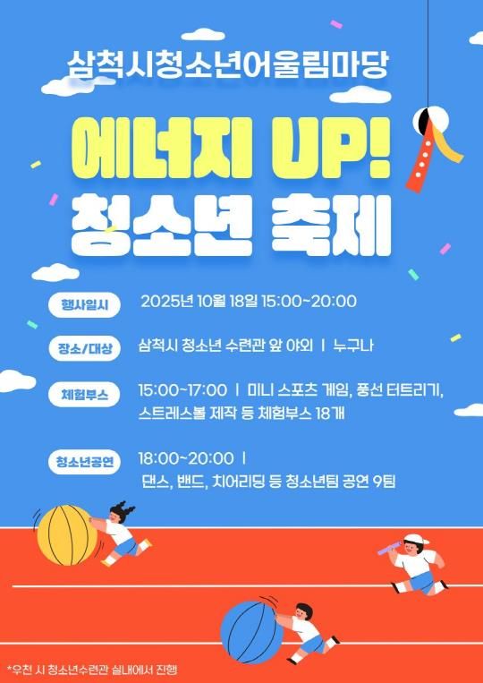 [비건뉴스=최지영 수습기자] 삼척시청소년수련관은 오는 10월 18일 오후 3시부터 관내 청소년과 가족을 대상으로 2025 삼척시청소년어울림마당 『에너지 UP! 청소년축제』를 개최한다.