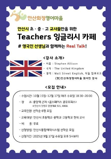[비건뉴스=최지영 수습기자] 안산시 안산화정영어마을은 오는 15일부터 12월 17일까지 관내 소속 교사를 대상으로 ‘티처스(Teachers) 잉글리시 카페’를 운영한다고 10일 밝혔다.