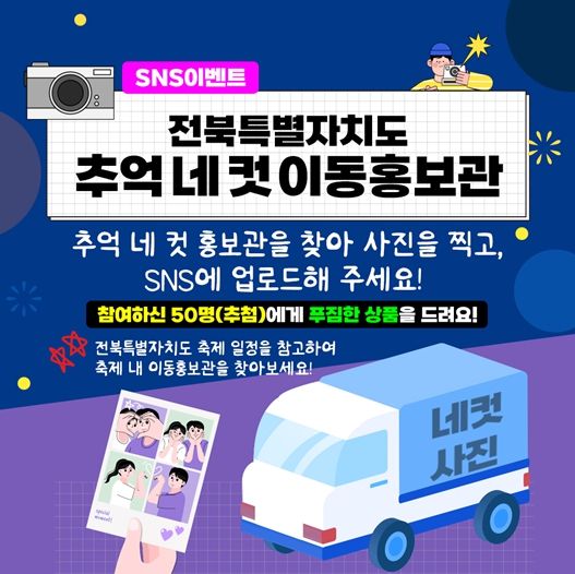 [비건뉴스=최지영 수습기자] 전북특별자치도는 10월 10일부터 11월 1일까지 도내 주요 축제 현장에서 ‘추억 네 컷 이동홍보관’을 운영한다고 밝혔다.