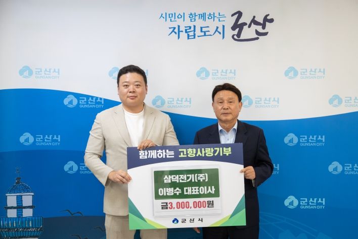 [비건뉴스=최지영 수습기자] 군산시는 삼덕전기(주) 이병수 대표이사가 고향사랑기부금 300만 원을 기탁했다고 밝혔다.